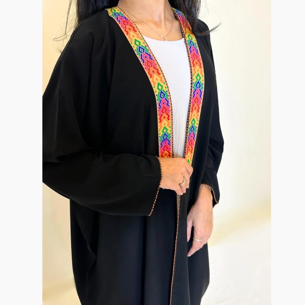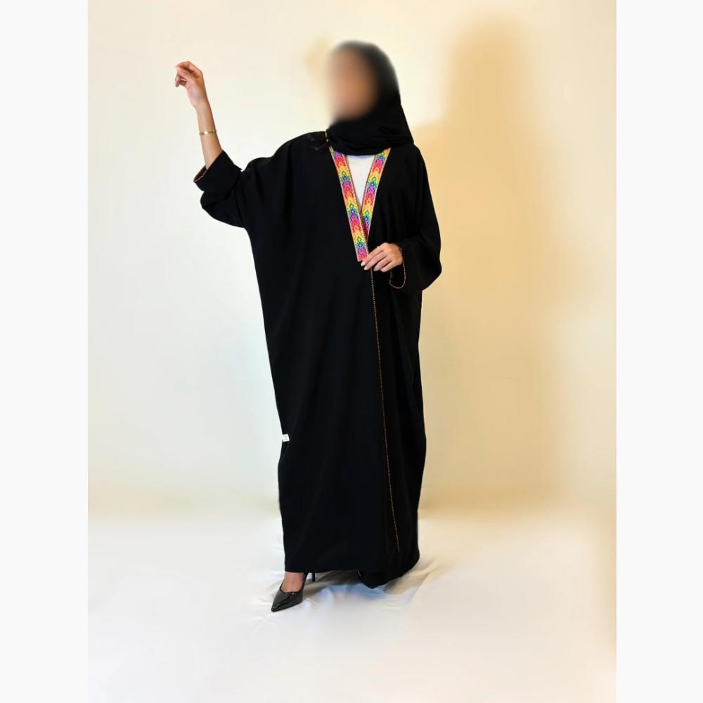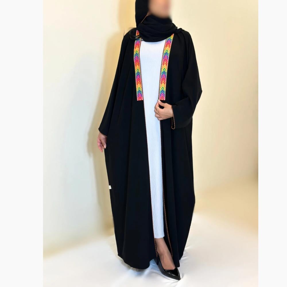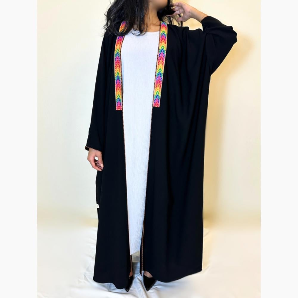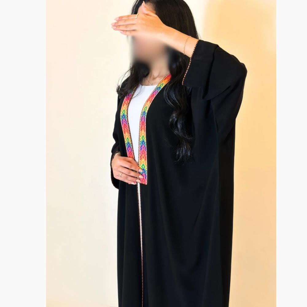 - أطراف مزينة بألوان راقية: تفاصيل جذابة تضيف لمسة جمالية مميزة تجعل العباية قطعة فريدة تناسب.