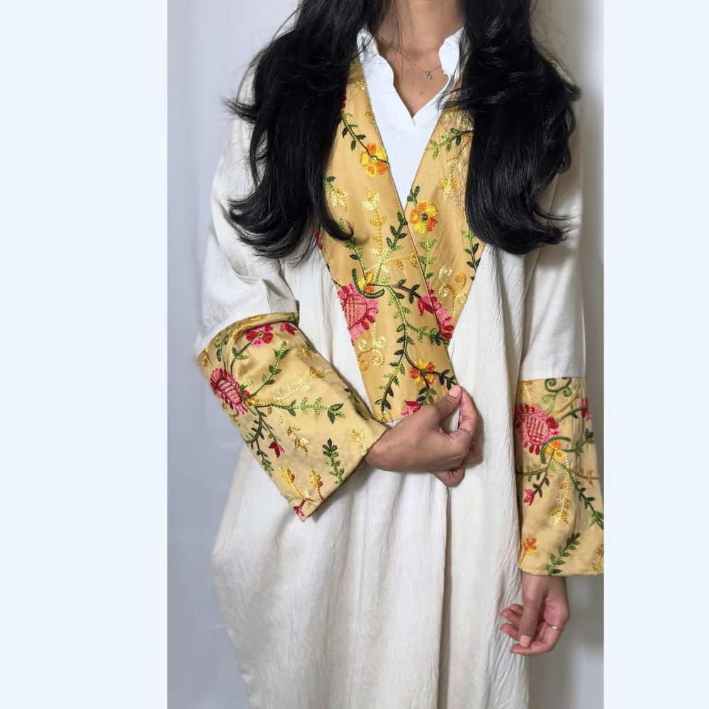 - أكمام بتفاصيل فاخرة: تطريز عالي الجودة باللون الذهبي المطفي يمنحك إطلالة ملكية راقية.